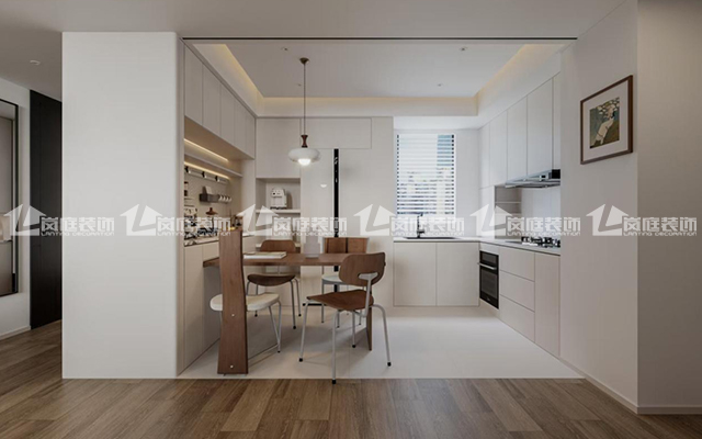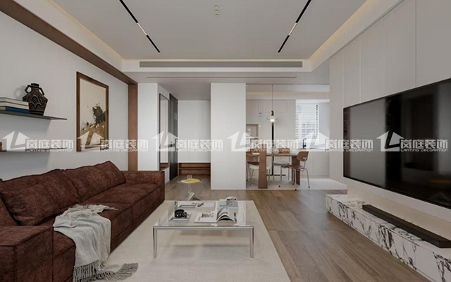 现代简约风格,色调整体偏暖,开放式厨房更通透。通过地面材质区分划分不同功能区域。