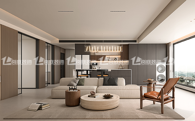 精髓在于顶级材质的凝练表达。空间以胡桃木烟熏橡木饰面构成基底,搭配感激纯牛皮系列纹路的模块化布艺沙发与洞石质感茶几,台盆柜、电视背景墙 让空间多了一份宁静。采用无主灯设计,以精确的嵌入式射灯和线性灯带勾勒轮廓。