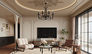 空间以浅灰色地砖通铺展开空间底色,简约而沉静,奠定了整体大气从容的基调,展开侘寂美学与现代居住理想的温柔对话。